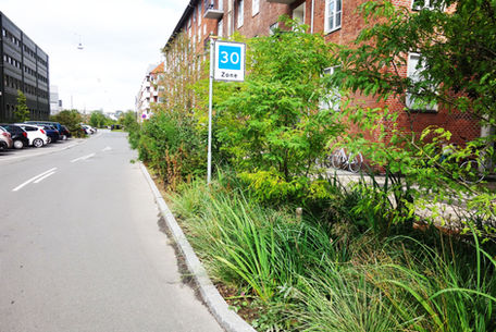 In the same area we can find the transformation of the sidewalks of Bryggervangen Street. They became, through simple measures, flourishing green corridors. Fed by water from the building’s gutters and occasionally by water containers for the plants that require more water, the spaces next to the sidewalks have been quickly colonized by many different botanical and entomological species, indispensable for managing the ecosystem equilibrium. Instead of channeling water from the roofs of neighboring buildings into the sewage system, the gutters channel it, passing under the pavement, to the flowerbeds. The gravely soil in the vicinity of the drains ensures a lowering in the kinetic energy of the water, guaranteeing greater longevity to what are apparently simple flowerbeds but conceal a functional water drainage system.