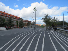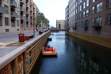 Inaugurated in December 2014, the Tåsinge-Plads (better known as Water Park) is the pilot project for the climate adaptive urban regeneration program, planned for the whole of Saint Kjeld's Kvarter. The key concept is that the square is designed aa basin for water storage in case of heavy raining or flooding. The entire masterplan of the district, designed by the Tredje Natur studio, is imagined with adaptation in mind, is foreseen the construction of green areas (green corridors, trees, rain-gardens, etc.) for a total of 50,000 m², in contrast with the 270,000 m² currently occupied by roads.